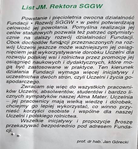 To dzięki zaangażowaniu profesora Jana Góreckiego, Fundacja która działalność rozpoczynała na ul. Rakowieckiej, po przeprowadzce na Kampus Ursynowski uzyskała dobre warunki do dalszej działalności.