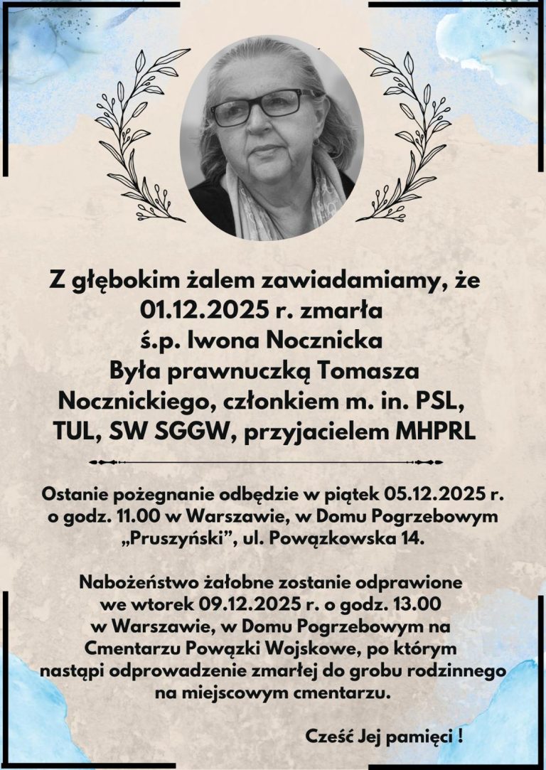 Z głębokim smutkiem zawiadamiamy, że 1 grudnia 2025 roku zmarła nasza Koleżanka Iwona Nocznicka. Ostatnie pożegnanie ś.p. Iwony Nocznickiej odbędzie się w piatek 5 grudnia 2025 r. o godz. 11.00 w Warszawie, w Domu Pogrzebowym „Pruszyński”, ul. Powązkowska 14.